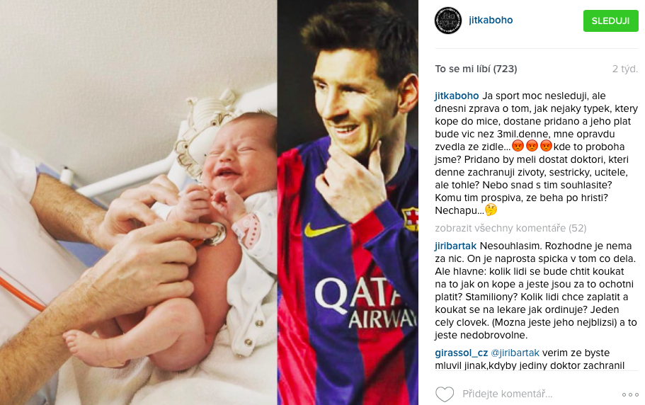 Už stačila pomluvit VERONIKU KOPŘIVOVOU (24), která nějaký ten pátek žije s božským JAROMÍREM JÁGREM (43). Ale tím její naštvané rozpoložení neskončilo. Do hledáčku se jí dostala i taková hvězda, jakou je světoznámý fotbalista LIONEL MESSI (28). Čím ji tak vytočil? Na svém Instagramu si od plic postěžovala: „Já sport moc nesleduji, ale dnešní zpráva o tom, jak nějaký týpek, který kope do míče, dostane přidáno a jeho plat bude víc než tři miliony denně, mě opravdu zvedla ze židle. Kde to proboha jsme? Přidáno by měli dostat doktoři, kteří denně zachraňují životy, sestřičky, učitelé, ale tohle? Komu tím prospívá, že běhá po hřišti? Nechápu…“