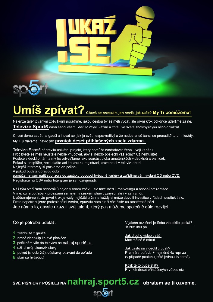 Sledovat nový pořad se však rozhodně vyplatí nejen proto, že si z toho můžete odnést řadu parádních cen. UKAŽ SE! má však „koule“ se vším všudy. Spojily se totiž s kapacity z hudební branže jako je třeba Michal David, Linda Finková a další. To už je samo o sobě zárukou kvality. Když interpret pošle svůj song,má k dispozici poradce, kteří poznají, jestli z něj může něco být. Žádná podobná soutěž momentálně v České republice neexistuje. Takže nalaďte SPORT5, ale ještě předtím si odhlasujte to své. Nechat ležet ceny jen tak? To nemá moc logiku…