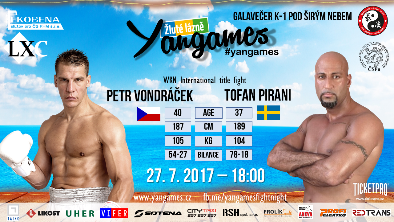Místem činu se stanou Žluté lázně a bude to nezapomenutelný večer. Aby také ne, když se na akci objeví nejen česká špička, ale také řada zahraničních borců. Legenda domáci scény Petr Vondráčk se utká o titul WKN a vypadá to na pořádnou dřinu. Jeho soupeřem totiž bude Tofan Pirani, Íránec se švédským občanstvím, který už má na kontě téměř stovku profesionálních zápasů. Sedmdesát procent vyhrál, většinou KO způsobem. Takto ukončený mač se tak očekává i tentokrát, my však doufáme, že titul zůstane doma!